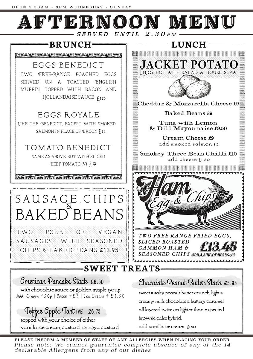 - Lunch: Enjoy a variety of sandwiches and hearty dishes like ham, free-range egg, and chips, alongside a comforting soup of the day.